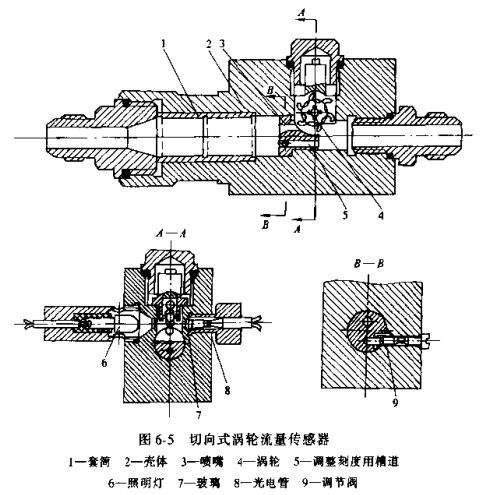 圖6-5所示為用于微流量測量的渦輪流量傳感器,流體從葉輪的切向流過,沖擊其葉片旋轉(zhuǎn)。由于被測流量較小,為加大流體對葉輪的沖力,入口處裝有噴嘴,可以更換噴嘴孔徑以調(diào)節(jié)流量范圍。葉輪的轉(zhuǎn)速采用光電法檢測,以避免如磁阻法產(chǎn)生磁阻力矩。葉輪軸與管道軸心垂直,流體流向葉片沖角約為90°,適合于小口徑微流量產(chǎn)品。