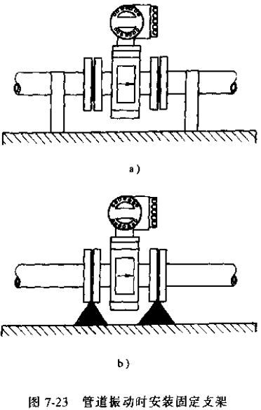 6)安裝在無振動(dòng)或振動(dòng)小的場所。如果振動(dòng)過大,則應(yīng)在傳感器前后的管道加固定支撐,如圖7-23所示。