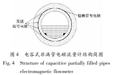 ②電容式非滿管軟化水流量計(jì)h。電容式非滿管軟化水流量計(jì)結(jié)構(gòu)簡圖如圖4所示。、檢測信號(hào)電極 發(fā)送信號(hào)電