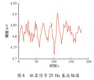 在頻域中對(duì)紙漿信號(hào)觀察時(shí)發(fā)現(xiàn),紙漿信號(hào)的漿液噪聲頻帶在零頻率點(diǎn)附近,距離流量信號(hào)基波頻率點(diǎn)較遠(yuǎn),對(duì)基波幅值和各奇次諧波幅值基本沒有影響,紙漿信號(hào)在頻域中的圖形如圖7所示。選擇一組采集的紙漿信號(hào),把其等分成數(shù)段,利用MATLAB計(jì)算每段數(shù)據(jù)在基波處的幅值并提取保存在一個(gè)數(shù)組中,使用繪圖工具畫出來,如圖8所示??梢姡ǚ翟?.7~4.95mV變化,波動(dòng)較小。因此,提取到的與流量相關(guān)的感應(yīng)電動(dòng)勢(shì)信號(hào)幅值會(huì)比較穩(wěn)定。