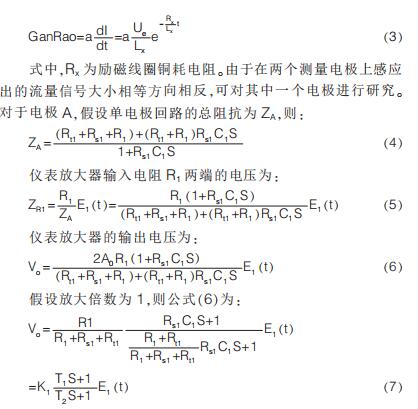 提出在硬件電路上加入模擬開關(guān), 干擾尖峰到來時斷開模擬開關(guān)避免干擾進入后級電路,尖峰過去重新打開模擬開關(guān);K.Saito 等提出漂移校正法,先以高勵磁頻率進行勵磁,在勵磁過程中插入低勵磁頻率提取用于漂移校正的非固定微分噪聲分量,但在插入的低勵磁頻率段漿液噪聲較大且很難將漿液噪聲與流量信號分離,此時的校正因子非單純的非固定噪聲分量,改進措施是長時間取平均值得到穩(wěn)定因子。 傳統(tǒng)方法是同步采樣保持法,即在磁場穩(wěn)定階段采樣。 其他消除干擾的方法有設(shè)置干擾補償機構(gòu)、控制勵磁電流變化率減小干擾幅值、矩形波代替梯形波、希爾伯特黃變換結(jié)合傅里葉變換和程控增益技術(shù)等。經(jīng)上述對現(xiàn)有的文獻分析與總結(jié)可知, 當前消除微分噪聲主要從信號處理方面入手,并未對影響噪聲的因素加以研究。 本文建立電極測量回路等效模型,給出仿真模型搭建、參數(shù)取值和仿真結(jié)果分析。