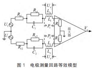 測量電極與流體介質接觸時會發(fā)生電化學反應在電極-溶液界面形成阻抗,通常由法拉*阻抗與雙電層電容并聯(lián)組成。 法拉*過程分為電荷傳遞過程和擴散過程,相應的法拉*阻抗由電荷傳遞電阻與擴散阻抗串聯(lián)組成。一般硫酸鐵流量計的勵磁頻率大于1Hz,而擴散阻抗發(fā)生在更低頻率內,不考慮擴散過程,電極等效阻抗為電荷傳遞電阻與雙電層電容并聯(lián)后再與電極接觸電阻串聯(lián)。 基于電極阻抗建立的電極等效測量回路如圖 1 所示。圖中:Rs1 和 Rs2 為電荷傳遞電阻;C1 和 C2 為雙電層電容;Rt為兩個測量電極間的接觸電阻滿足 Rt=Rt1+Rt2;Lx 為勵磁線圈等效電感;L1 為閉合回路等效電感;R1 和 R2 為放大器輸入電阻;P1和 P2 為由“變壓器效應”疊加在測量電極上的微分干擾;U1 為流體切割磁力線產(chǎn)生的感應電勢;Ue 為勵磁電壓。 假設磁感應強度由勵磁電流決定且成正比關系即 B=aI,忽略串模等干擾則電極間電壓為感應電勢與微分干擾的疊加,基本方程如下:
