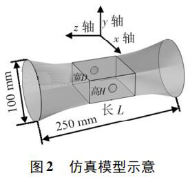 使用 Pro /E 軟件建立三維幾何模型,導入 COMSOL 軟件進行有限元求解。仿真模型如圖 2 所示,電極連線為x 軸,連線中點為坐標原點,流體運動方向為 z 軸,傳感器管道口徑為 DN100,總長250 mm。異徑管部分初始結(jié)構(gòu)尺寸 L = 80 mm,D = 80 mm,H = 40 mm,圓形電極半徑為17 mm,伸出絕緣襯里的*大距離為 1. 5 mm。