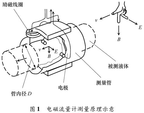 智能型防腐電磁流量計(jì)的測量原理如圖 1 所示。根據(jù)法拉*電磁感應(yīng)定律,導(dǎo)電液體在磁場中流動會產(chǎn)生電動勢 E,它與磁感應(yīng)強(qiáng)度 B、導(dǎo)電液體平均流速 v 成一定比例關(guān)系: