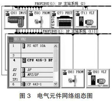 (1)電氣元件組態(tài)。把增加的質(zhì)量流量計(jì)和變頻器添加到香料廚房 S7-400 PLC 控制系統(tǒng)的 PROFIBUS 網(wǎng)中,其網(wǎng)絡(luò)組態(tài)如圖 3 所示,圖中 PROFIBUS-DP 地址 88 和 89 為硬件系統(tǒng)增加的質(zhì)量流量計(jì)和變頻器。