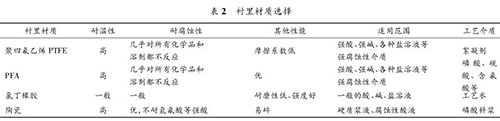 液體流量計要根據(jù)被測流體的溫度、壓力、速度以及含固顆粒的硬度、含量和粒徑大小來決定測量管內(nèi)襯的材質(zhì)。該濕法磷酸裝置中,液體流量計測量管襯里材質(zhì)的種類見表 2。