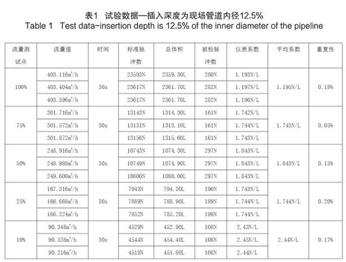 氣體渦輪流量計插入深度為現(xiàn)場管道內(nèi)徑的50%時,試驗數(shù)據(jù)如下(以 DN200 為例):