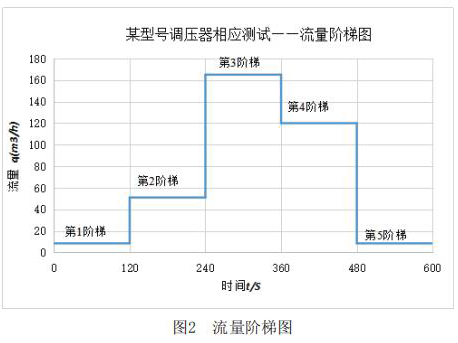 該測試主要利用實驗室測試條件,模擬客戶現(xiàn)場使用情況。其主要測試內(nèi)容包括:測試分體式電磁流量計在+23℃,-30℃和-40℃三種溫度下,分體式電磁流量計出口壓力分別在2.1kPa和30kPa時,流量分別從*1階梯到*5階梯時的響應(yīng)速度,客戶所提供的流量階梯如圖2所示。橫軸表示下游球閥開啟動作時間,縱軸表示分體式電磁流量計下游需要的流量q。