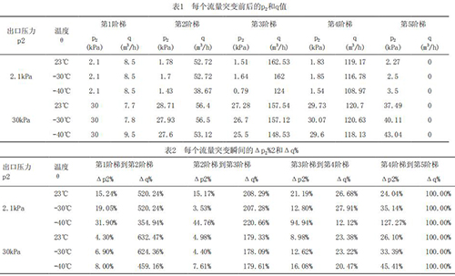 為了深入研究溫度及流量突變對分體式電磁流量計響應(yīng)速度的影響趨勢,把每個流量突變點前后的出口壓力p2,流量q列表如表1所示。