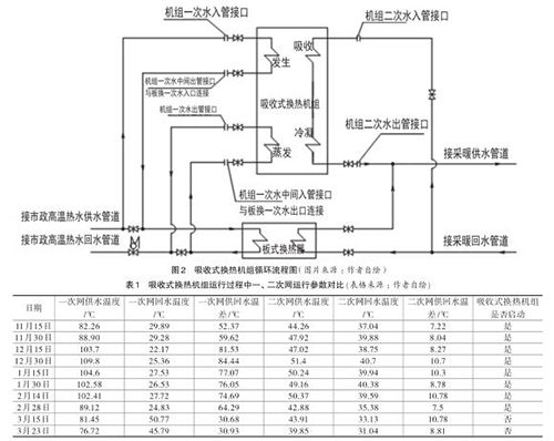 此熱力站電廠煙氣流量計的一次網(wǎng)設(shè)計供回水設(shè)計溫度為 :120℃ /36℃,二次網(wǎng)設(shè)計供回水溫度為 :80℃ /60℃。在電廠煙氣流量計工作流程中(見圖2),高溫?zé)嵩矗匆淮尉W(wǎng)供水)先進入電廠煙氣流量計,發(fā)生器作為驅(qū)動熱源,換熱后進入板式換熱器,經(jīng)板式換熱器換熱后的低溫水再次回到電廠煙氣流量計的蒸發(fā)器,放熱至36℃后返回電廠。熱用戶的二次網(wǎng)回水并聯(lián)后分別進入電廠煙氣流量計吸收器和板式換熱器,在吸收器和冷凝器及板式換熱器中分別進行熱交換,然后一起供給熱用戶。上述過程就是在電廠煙氣流量計啟動時,熱力站內(nèi)的實際供熱流程,在供暖季的初期和末期,可以關(guān)閉電廠煙氣流量計,仍然利用板式換熱器單好換熱。