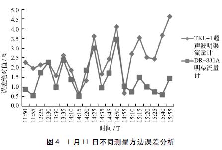 由圖4可知,以手工實(shí)測(cè)液位高度為基準(zhǔn),2種流量計(jì)的誤差均在±5%的范圍內(nèi)。1月11日12:30~14:55期間,DR-831A和TKL-Ⅰ測(cè)量誤差比較接近。其他時(shí)段,2者呈現(xiàn)出前者測(cè)量誤差要小于后者測(cè)量誤差。