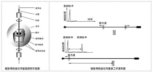 磁致伸縮式液位計的基本原理如下圖所示。其結(jié)構(gòu)分為三部分:浮球、變送器和裝有磁致線的不銹鋼測量管。當(dāng)變送器接通電源后,脈沖發(fā)送器和接收器開始工作,發(fā)送器定時向下端發(fā)送低電流詢問脈沖信號,脈沖及其磁場順著磁致伸縮線向下運行,當(dāng)脈沖信號的磁場與浮球內(nèi)的磁場相遇時,產(chǎn)生扭應(yīng)力脈沖,這個扭應(yīng)力脈沖向磁致線兩端傳送。向下傳送的扭應(yīng)力脈沖被阻尼吸收,向上傳送的扭應(yīng)力脈沖被接收器接收并檢測出來。根據(jù)從發(fā)出詢問脈沖到接收返回扭應(yīng)力脈沖的時間差,就可計算出液位的高度并轉(zhuǎn)換成4~20mA的輸出信號。