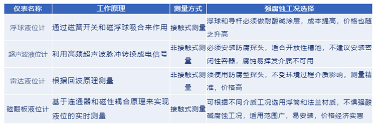 目前,市面上比較常用的液位儀表有浮球液位計(jì)、超聲波液位計(jì)、雷達(dá)液位計(jì)、磁翻板液位計(jì)等。鑒于所測(cè)介質(zhì)腐蝕性較強(qiáng)的特點(diǎn),我們對(duì)這幾款液位計(jì)在強(qiáng)腐蝕介質(zhì)測(cè)量中的優(yōu)劣勢(shì)對(duì)比如下: