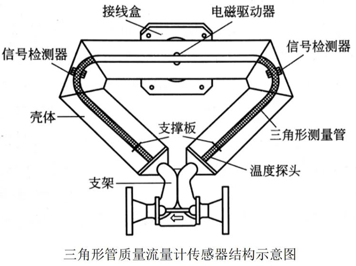 科氏力式質(zhì)量流量計運用流體質(zhì)量流量對振動管振蕩的調(diào)制作用為原理。傳感器由振動 管(測量管)、信號檢測器、振動驅(qū)動器、支撐結(jié)構(gòu)和殼體組成,如下圖所示。