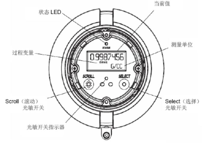 顯示器面板由一個用于顯示過程變量的液晶顯示器;一個用以指示質(zhì)量流量計的工作狀態(tài)的質(zhì)量流量計工作狀態(tài)LED 指示燈;兩個光敏按鍵<Scroll>和<Select>以及一個用于按鍵響應(yīng)指示的LED 燈組成。
