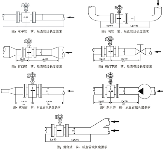 比較理想的安裝地點(diǎn)應(yīng)選擇測(cè)量點(diǎn)前后有足夠的直管段。進(jìn)口直管段應(yīng)≥5D,出口直管段≥3D(D為傳感器公稱口徑)。
