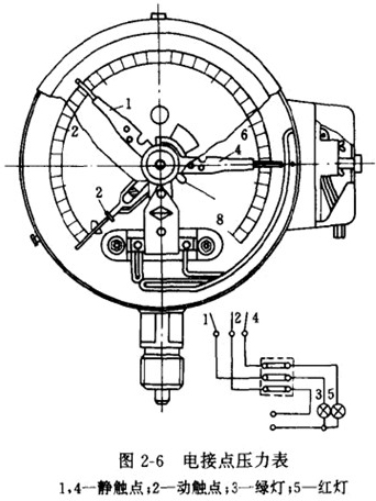 電接點壓力表是在彈簧管式壓力表上附加電接點而構(gòu)成的位式作用傳感器。指示部分的結(jié)構(gòu)和普通壓力喪完全相同,但增加兩對電接點分別提供上、下限報普信號。上、下限的壓力值可以調(diào)整.當指針到達報警上限壓力時.上限電接點動作.發(fā)出報苦信號。壓力超過報警上限時,電接點保待在報警狀態(tài),而指針仍然能指示壓力。下限電接點的動作原理也一樣.這種電接點壓力表把指示和位式信號功能結(jié)合在一起,比較方便而實用。外形直徑和普通壓力表相近,價格也相差無幾。但厚度稍大。