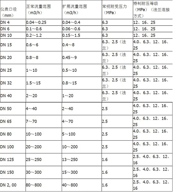 儀表口徑及連接方式:4、6、10、15、20、25、32、40采用螺紋連接;15、20、25、32、40)50、65、80、100、125、150、200采用法蘭連接;